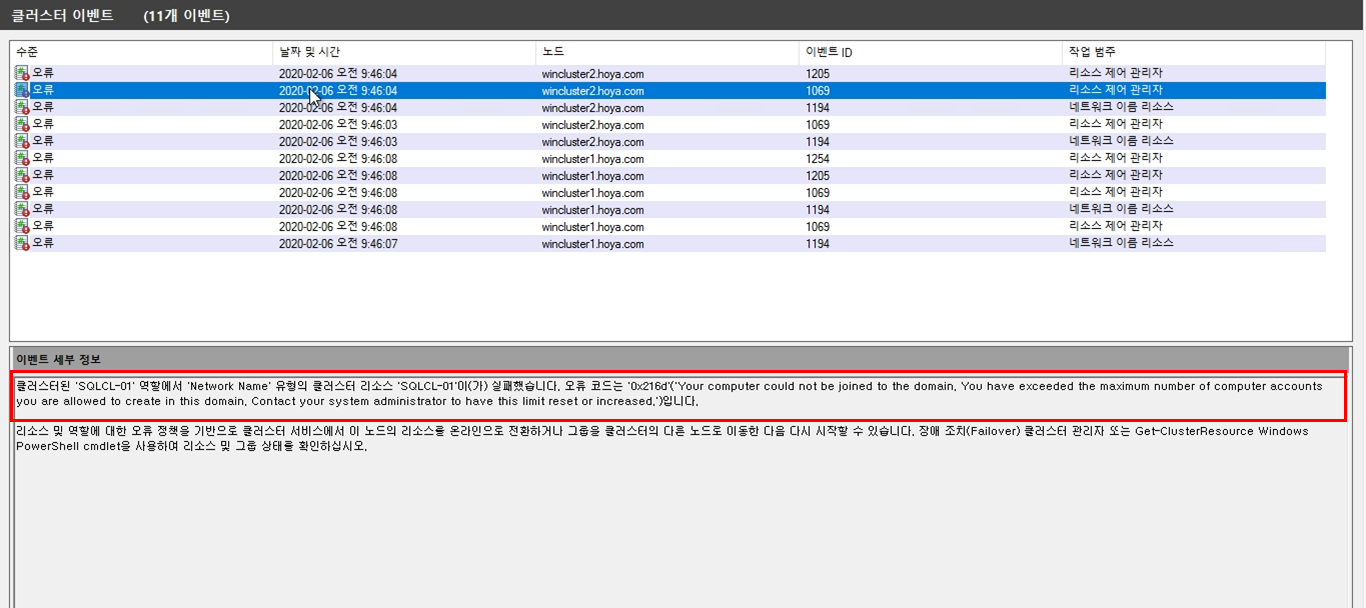 SQL Serer Failover 클러스터 설치시, "SQL Server 네트워크 이름"에 지정한 컴퓨터 계정이 도메인 컨트롤러의 Computer 그룹에 등록이 되는데, 이때 도메인컨트롤러에서 설정한 ms-DS-MachineAccountQuota(계정당 도메인에 추가할 컴퓨터 계정의 최대값) 속성의 값을 초과할 경우 발생