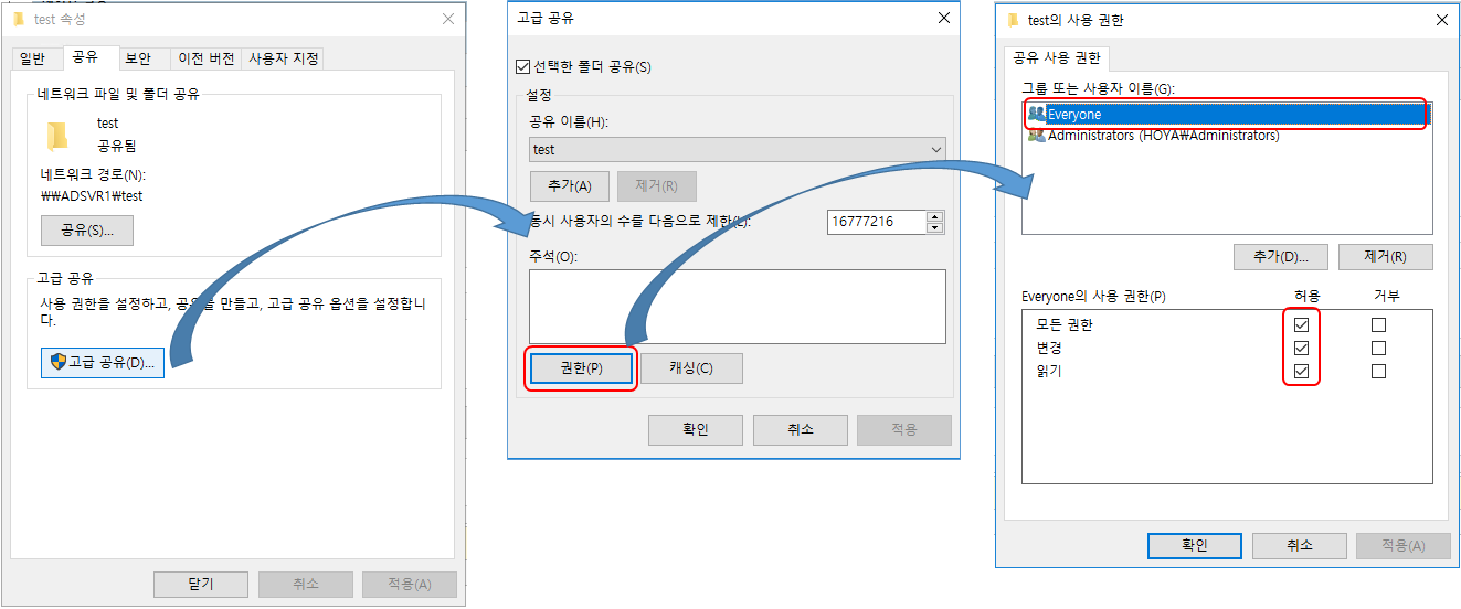 윈도우즈 공유중 "네트워크 파일 및 폴더 공유"와 "고급공유"의 차이점 및 각각 공유에 권한이 어떻게 변화는지 알아보도록 한다.