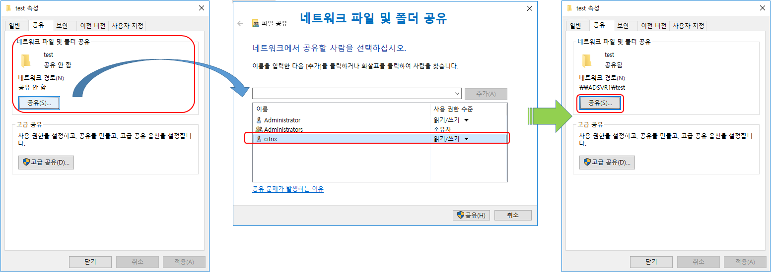 - citrix 사용자는 test 공유폴더에 모든 권한을 가진다.(공유 권한의 everyone 모든권한과 NTFS의 authenticated users 수정권한= 결과 모든 권한)