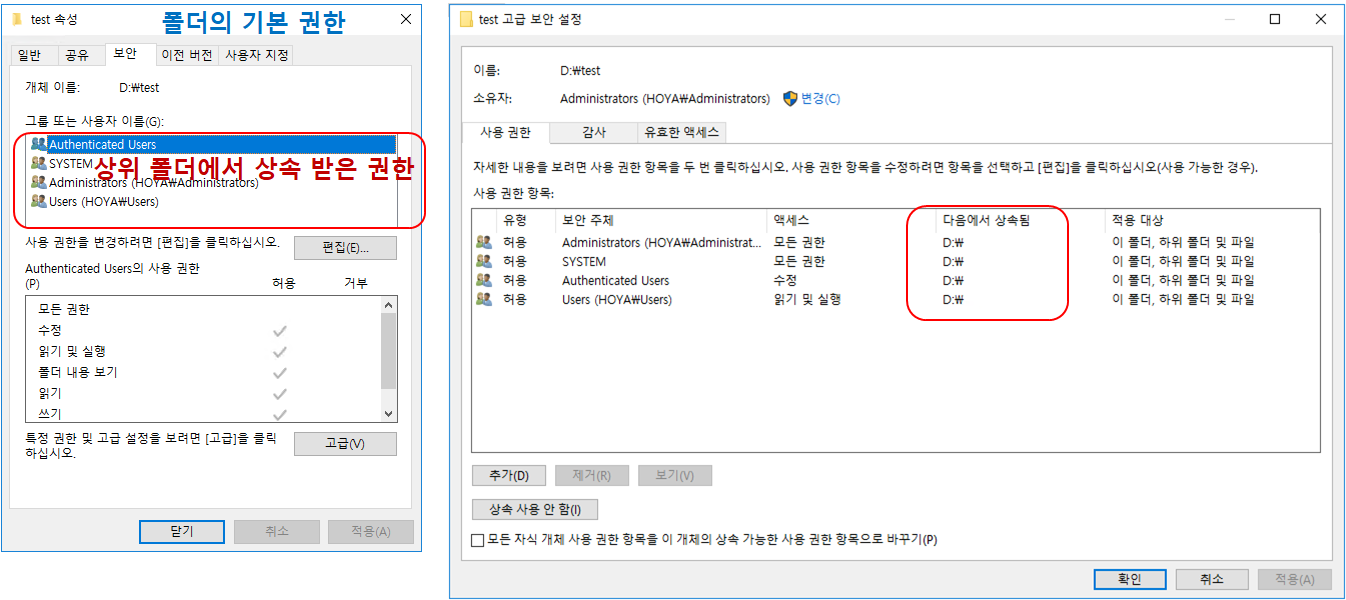 폴더를 생성하면 기본 권한은 상위 폴더의 권한을 상속 받게 된다.
