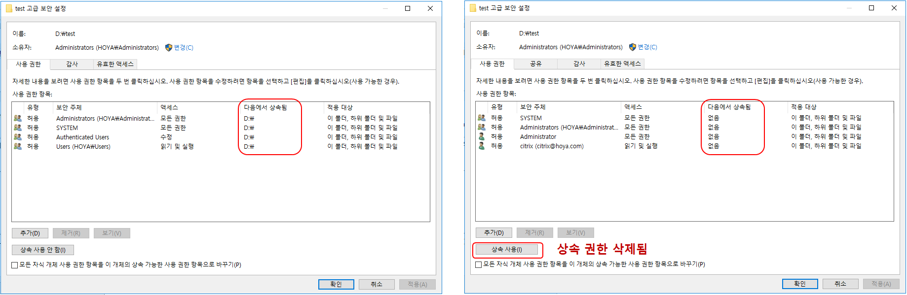 - "네트워크 파일 및 폴더 공유"에서 추가한 사용자만 표시되고 상속받은사용자는 제거됨
