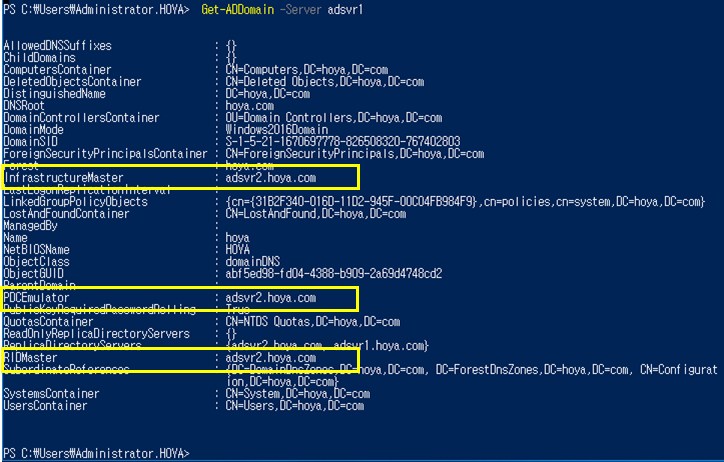예) 아래 예는 모든 FSMO을 adsvr1.hoya.com 이 가지고 있음
