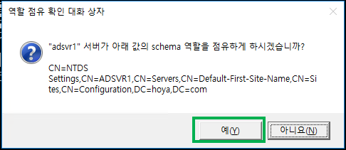 예) hoya.com 도메인에 adsvr1, adsvr2 두개의 도메인 컨트롤러가 있고, schema master의 역할을 adsvr2가 가지고 있다. 스키마 마스터 역할을 adsvr1에서 확보한다.