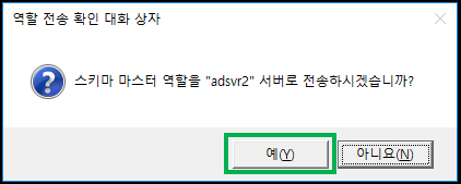 예) hoya.com 도메인에 adsvr1, adsvr2 두개의 도메인 컨트롤러가 있고, FSMO의 모든 역할을 adsvr1가 가지고 있다. 이중에서 스키마 마스터 역할을 adsvr2 로 전송한다.