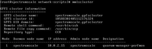 shell> mmcrcluster -N /tmp/nodelist -C spectrumscale.gpfscluster
