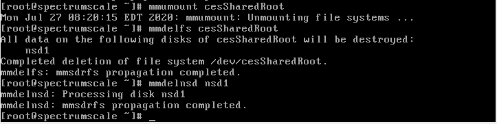 | shell> mmdelfs cesSharedRoot shell> mmdelnsd nsd1 |