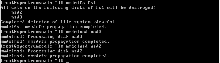 | shell> mmdelfs fs1 shell> mmdelnsd nsd3 shell> mmdelnsd nsd2 |