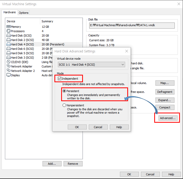 생성한 디스크의 Advance 속성의 Mode에서 Independent및 persistent 체크