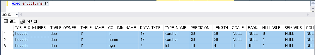 | EXEC sp_columns 테이블이름 |