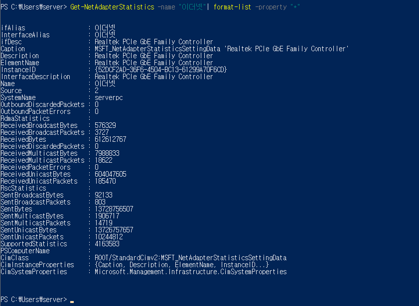 SYNTAX) Get-NetAdapterStatistics -name "인터페이스이름" | format-list -property "*"