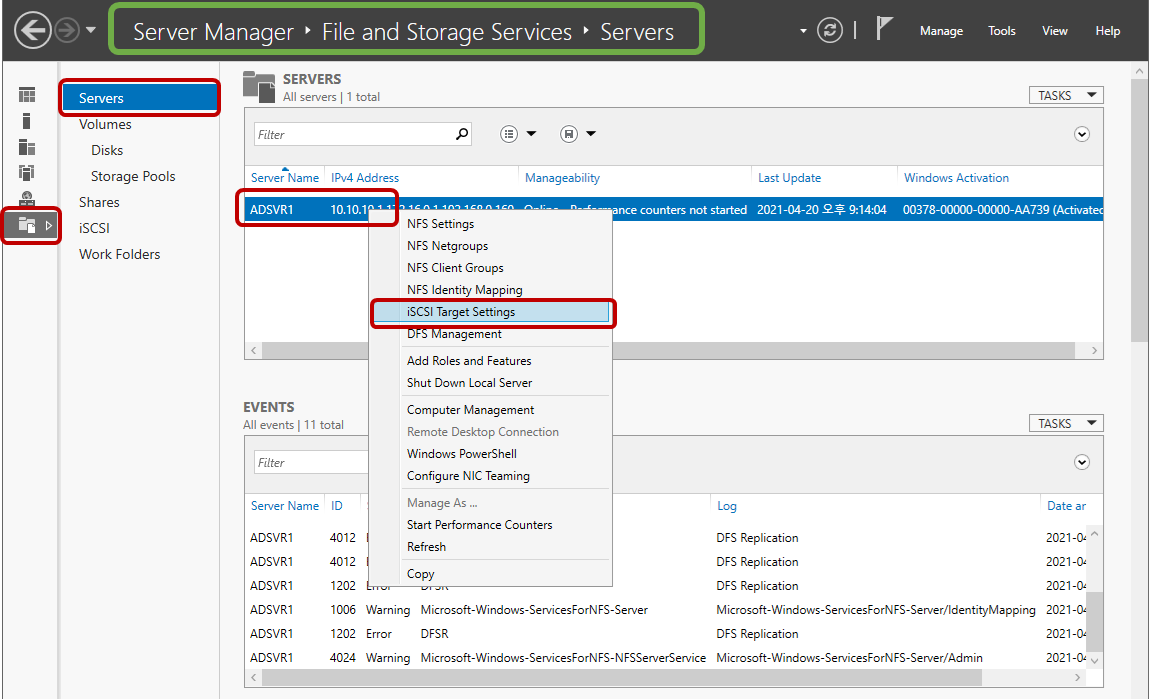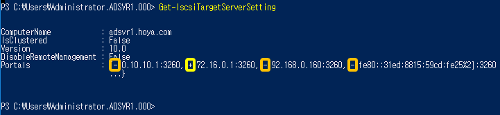 1. 현재 iSCSI 서비스를 하는 IP 확인(Get-IscsiTargetServerSetting)