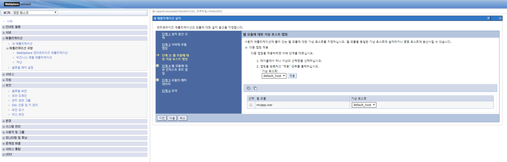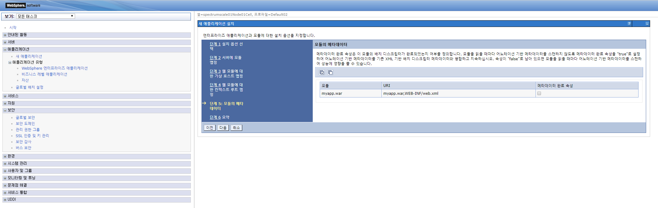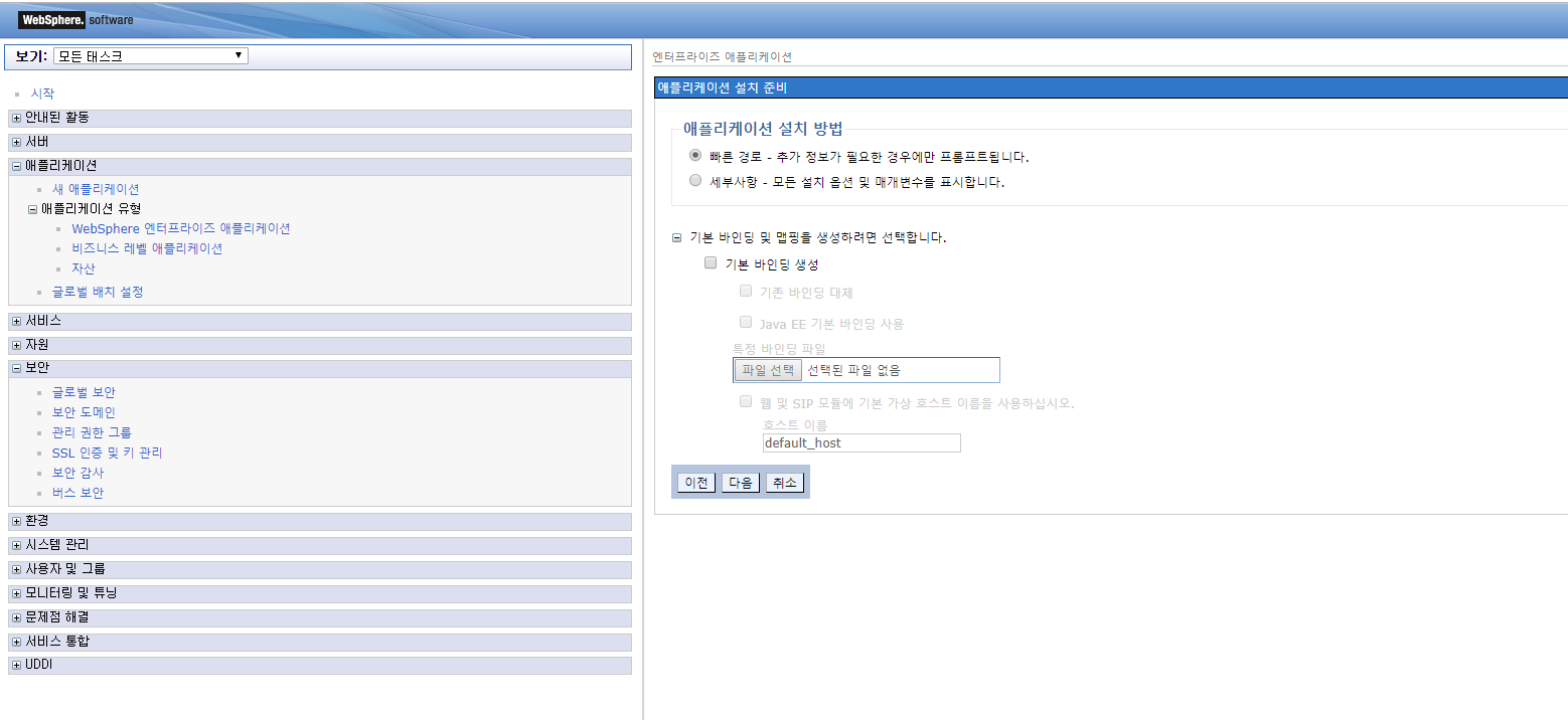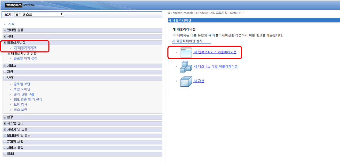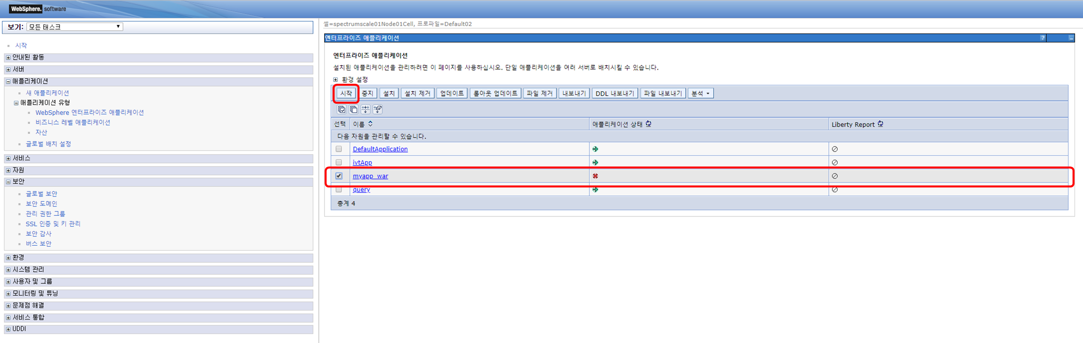 step 1) 애플리케이션 > 애플리케이션 유형 > WebSphere 엔터프라이즈 애플리케이션 > 애플리케이션 선택 > 시작