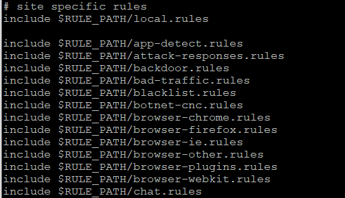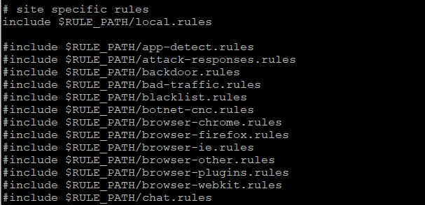 local.rules을 제외한 나머지는 주석(#)처리, 초기 설치시 해당 rule이 없으므로 site specific rules 모두를 주석 처리한다.