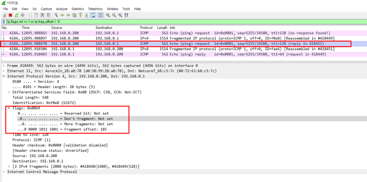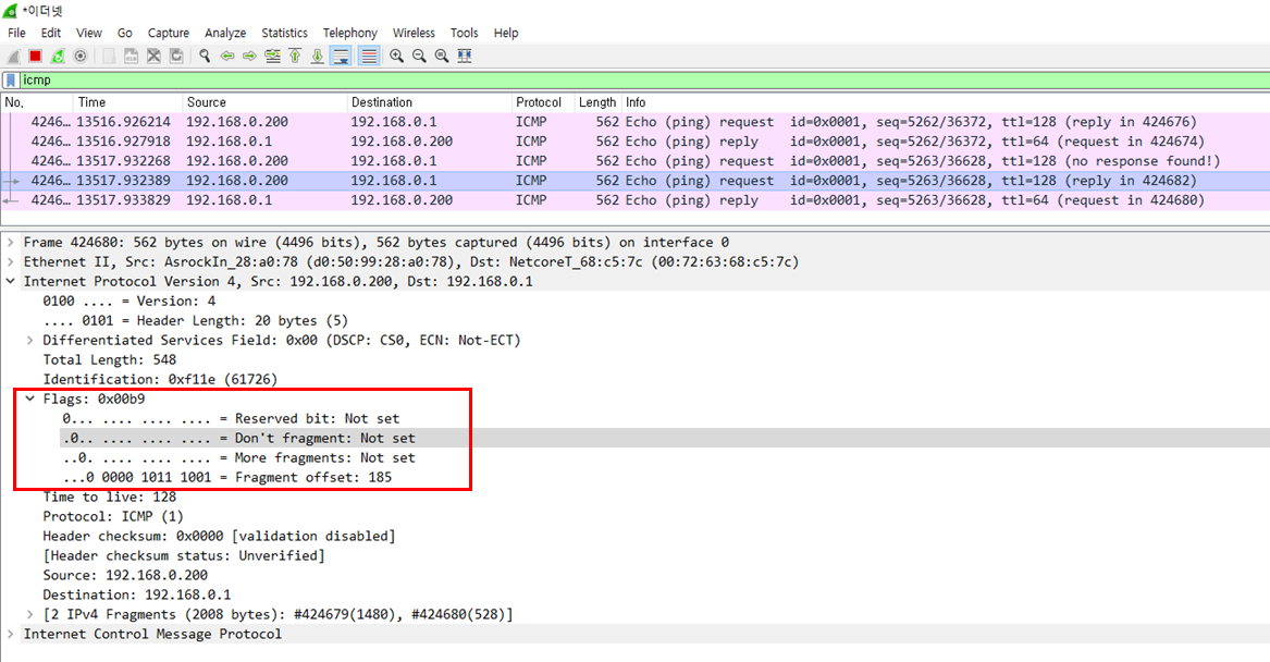 fragment offset 필드에 값이 설정된 걸로 보아 fragment 패킷임을 짐작할수 있다