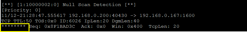 alert tcp any any -> any any (msg:"Null Scan Detection";flags:0;sid:10000002;)