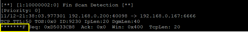 alert tcp any any -> any any (msg:"Fin Scan Detection";flags:F;sid:10000003;)