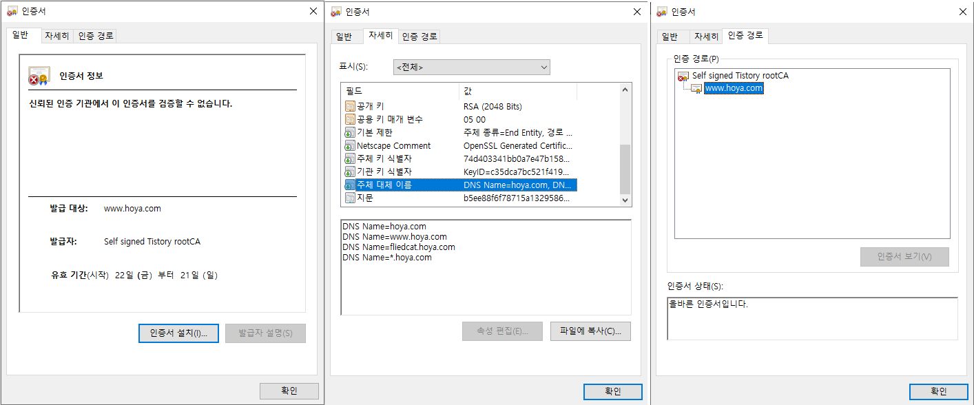 | [ req ] ...... req_extensions = v3_req # The extensions to add to a certificate request => 맨 앞의 주석 제거 ...... [ v3_req ] ..... subjectAltName = @alternate_names => [ v3_req ] 섹션에 추가, 이렇게 함으로써 alternate_names 항목을 읽음 # [ alternate_names] 섹션을 추가 하고 해당 섹션에 대체이름을 추가 한다. [ alternate_names ] DNS.1 = hoya.com DNS.2 = www.hoya.com DNS.3 = fliedcat.hoya.com DNS.4 = *.hoya.com |