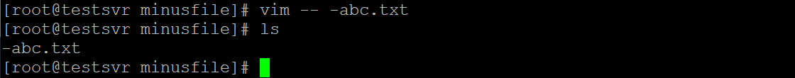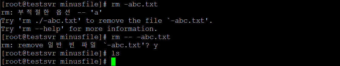 -(마이너스)로 시작하는 파일을 일반파일로 인식하기 위해서는 -(마이너스)로 시작하는 파일 앞에 --(마이너스부호 2개) 를 붙임으로써 해결 할수 있다. 아래 예를 보면서 이해를 해보자