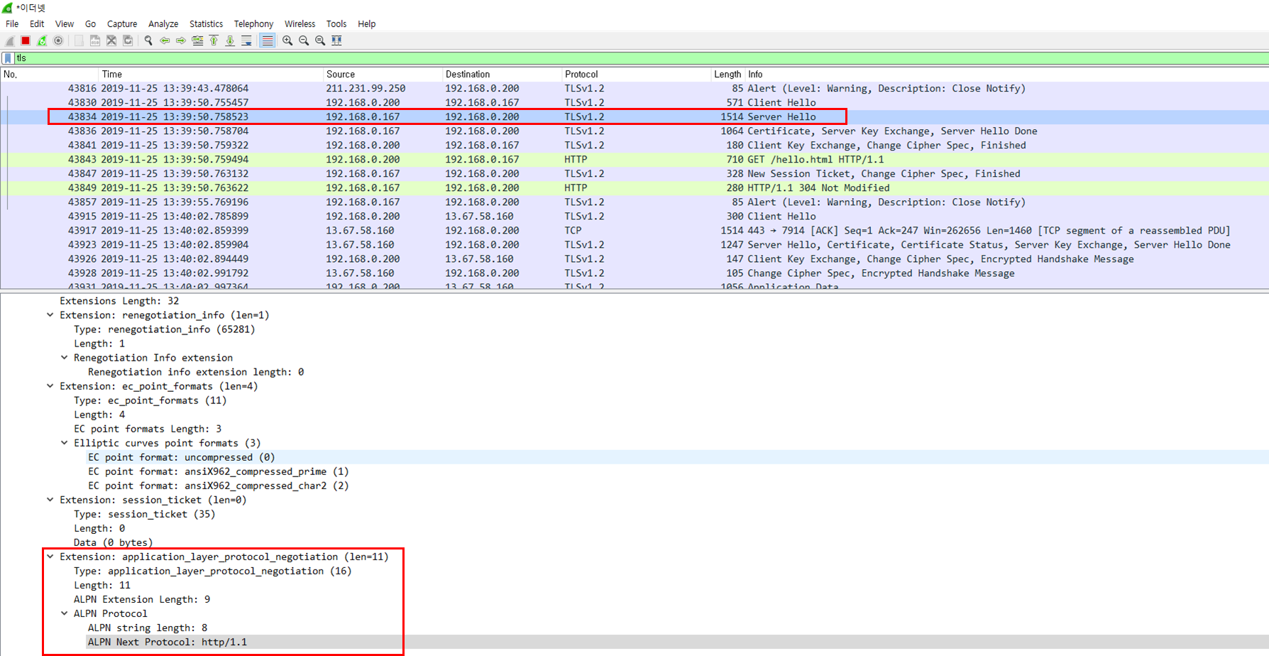 2.3 웹서버에서 http2를 지원하지 않을 경우 server Hello에서 ALPN에 http1.1 선택해서 응답