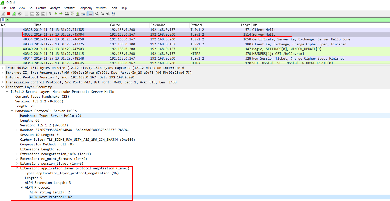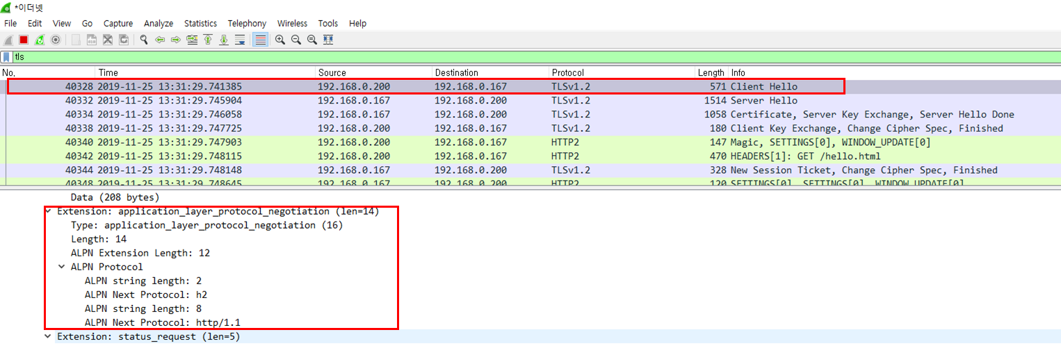 2.2 웹서버에서 http2를 지원할경우 Server Hello에서 ALPN에 h2 선택해서 응답