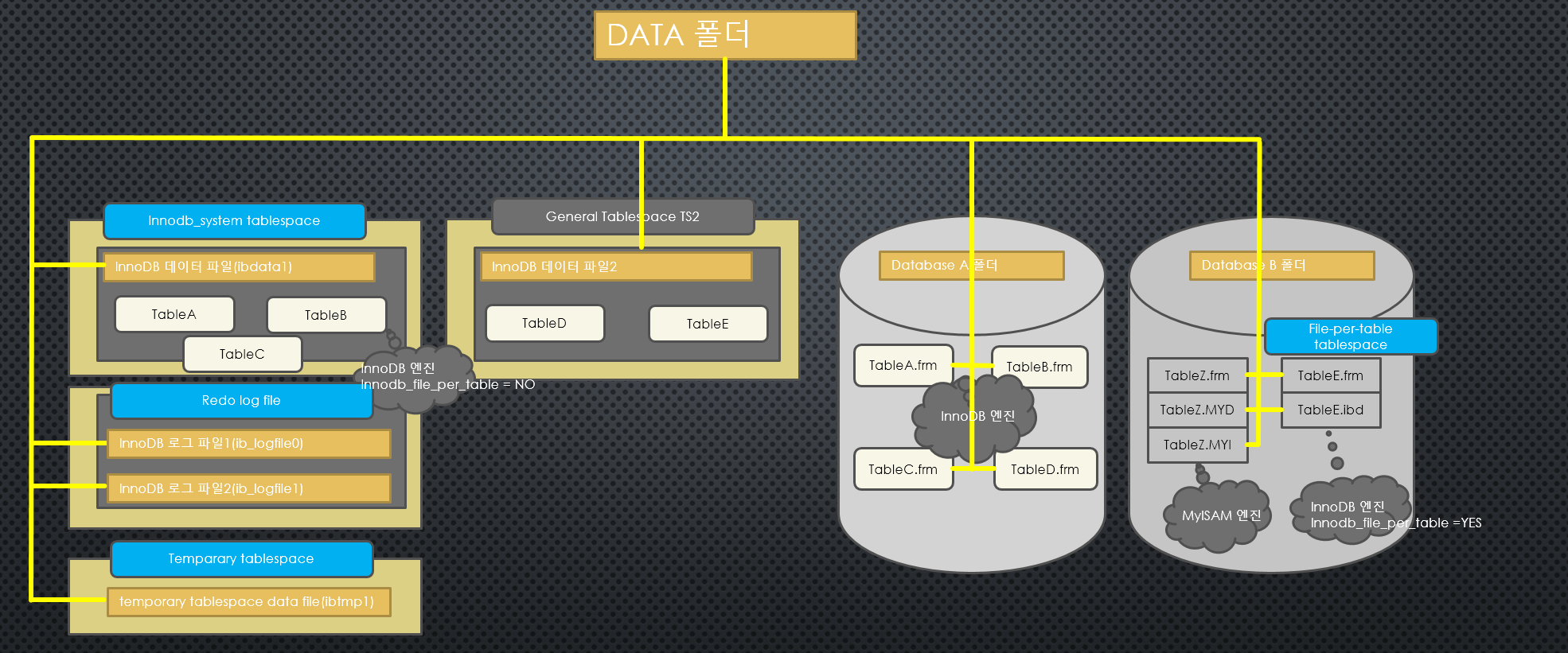 InnoDB 테이블 : 테이블의 데이타는 테이블스페이스에 저장되고, 테이블 구조 파일은 database 디렉토리에 <테이블이름>.frm 형태로 존재