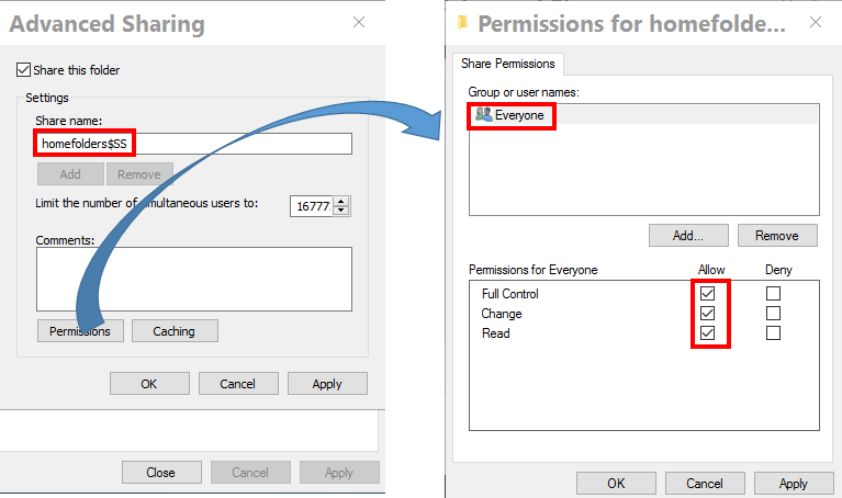 - Everyone에 대한 공유 권한을 Full Control 로 변경